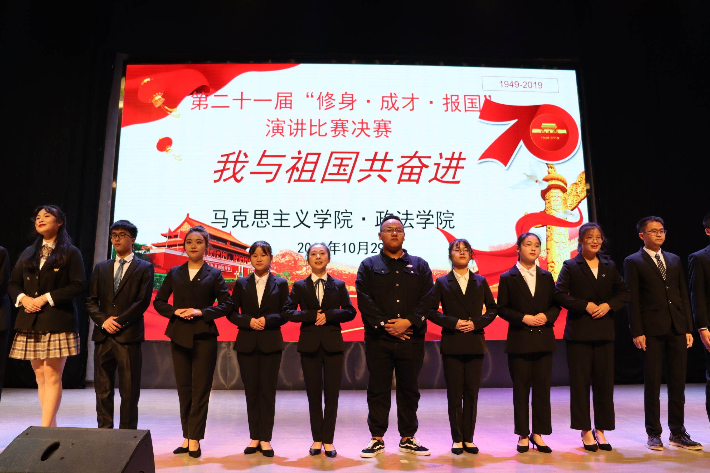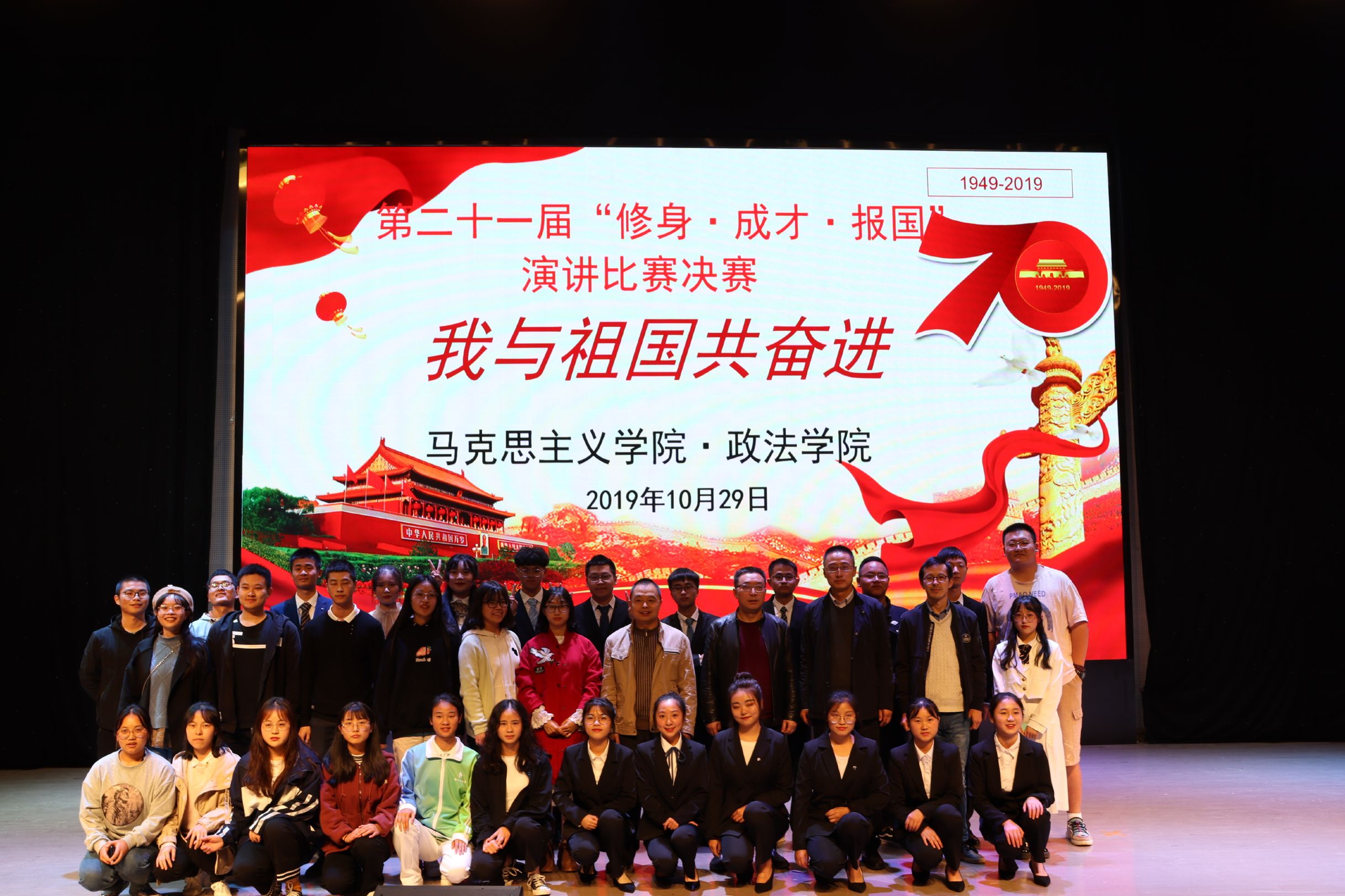 10月29日晚,公司在艺术传媒大楼多功能厅举办以“我与祖国共奋进”为主题的第二十一届“修身.成才.报国”演讲比赛决赛。党总支书记刘春辉、党总支副书记吴辉兵、学工办主任唐幸福、辅导员曾亚、历史与纲要教研室主任王盟、优秀青年教师张岚、2017级优秀辩手蔡润禾担任评委,2018级、2019级员工到场观看比赛。