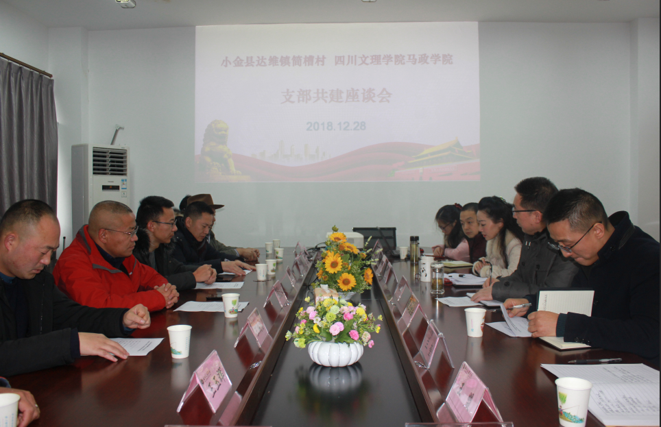 2018年12月28日上午10点,小金县达维镇简槽村与马政公司党支部共建交流座谈会在第一教楼611会议室如期顺利召开。会议由公司党总支副书记吴辉兵主持。小金县达维镇书记杨发君、镇长张君杰及简槽村几位主要基层干部,公司驻村扶贫干部曾宪志和文敏熙,党总支书记刘春辉、公司经理王秀珍和党总支副书记吴辉兵及公司相关教师代表参加了此次会议。