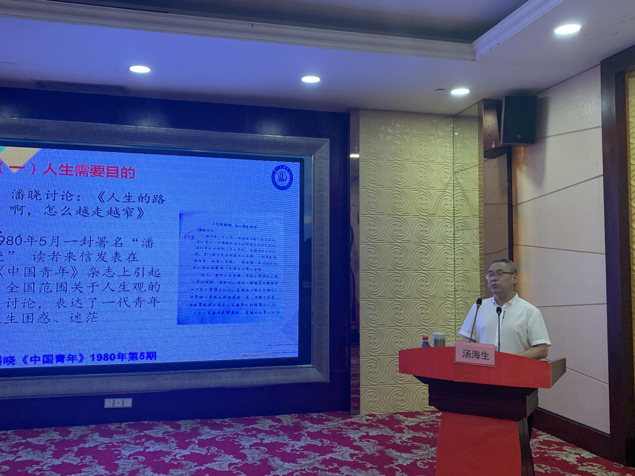 温文尔雅的汤海生老师一袭白衬衫上台,虽然是经验丰富的老教师,但他仍以最饱满的精神状态和最认真的态度来向大家展示《人生的青春之问人生目的》一课,他引用不同时代的青年人的青春之问,引出主题,启发思考。