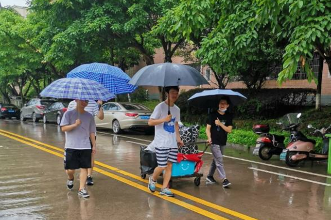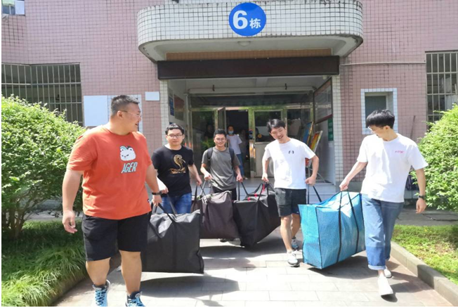 在离校期间,师生志愿者帮助毕业生打包、搬运行李,帮助员工离校。志愿者们团结协作不辞劳苦顶着烈日冒着大雨,把行李等物品有序地放在拖车上,在寝室与快递站之间往返。