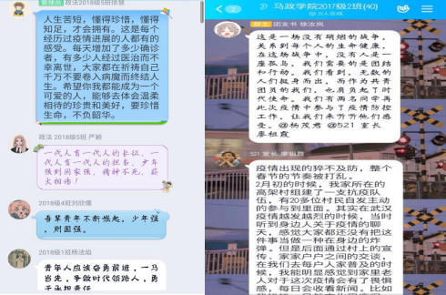 “战疫”志愿者代表分享了他们的“战疫”故事和学习心得。2017级2班的杨茂君讲述了自己的故事并说到:“在疫情暴发时,自己产生了投身于抗疫志愿队的想法并付诸行动。我特别庆幸,我是中国人,我为生在中国而骄傲和自豪!”2017级2班的廖祖霞谈到自己的感受:“强健体魄,战胜一切艰难险阻,做一个肩有大任的新时代青年,为社会贡献自己的力量。”2018级1班的廖洁说:“面对此次疫情大考开始时会觉得很无助,但是通过深入群众服务,让我感受到了作为青年的我们与全国人民一起战斗,终将迎来胜利。”2018级4班的伍家根说到:“作为当代青年老员工,在新冠肺炎的严峻挑战下,应该有挺身而出的觉悟,肩负起时代的使命,团结努力抗击疫情。”