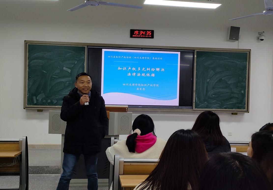 知识产权公司党委书记岳臣忠为2023级知识产权专业同学作《知识产权多元纠纷解决法律法规依据》学术讲座。他从知识产权纠纷解决的政策依据、法律依据、行政规章等方面系统介绍了我国知识产权纠纷解决的司法、行政执法和调解等方面有关情况,并结合省市经济和社会发展解读了知识产权十四五发展规划纲要所设定的相关目标。