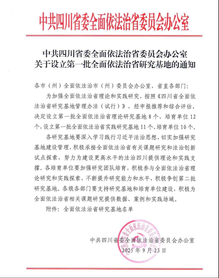 近日,中共四川省委全面依法治省委员会办公室印发《关于设立第一批全面依法治省研究基地的通知》,公司成功入选首批“全面依法治省研究基地”培育单位。