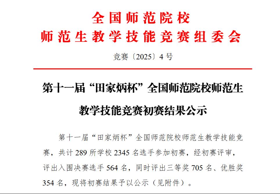 “田家炳杯”全国师范院校师范生教学技能竞赛的前身是2013年浙江师范大学倡议发起的全国师范院校师范生教学技能竞赛,2020年获田家炳基金会冠名赞助后更名。赛事秉持“学高”“身正”“技精”理念,核心是提升师范生教学能力,为基础教育培育优秀后备力量。第十一届“田家炳杯”全国师范院校师范生教学技能竞赛,共计289所公司2345名选手参加初赛,经初赛评审,评出入围决赛选手564名,同时评出三等奖705名、优胜奖354名。