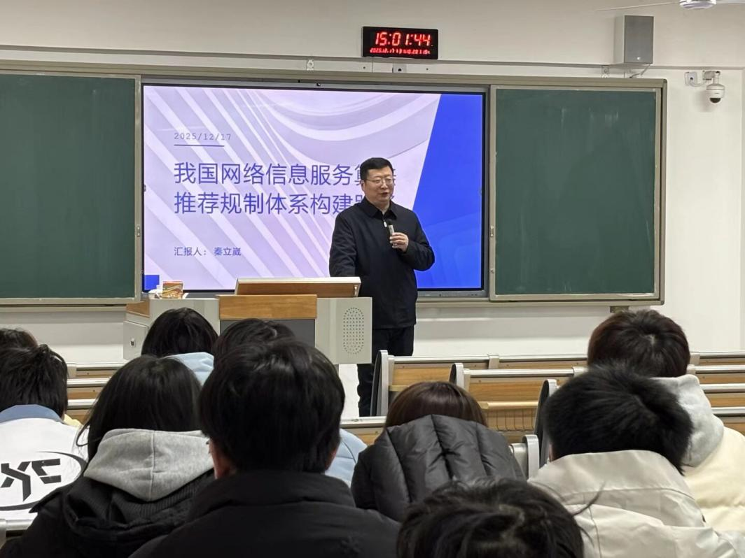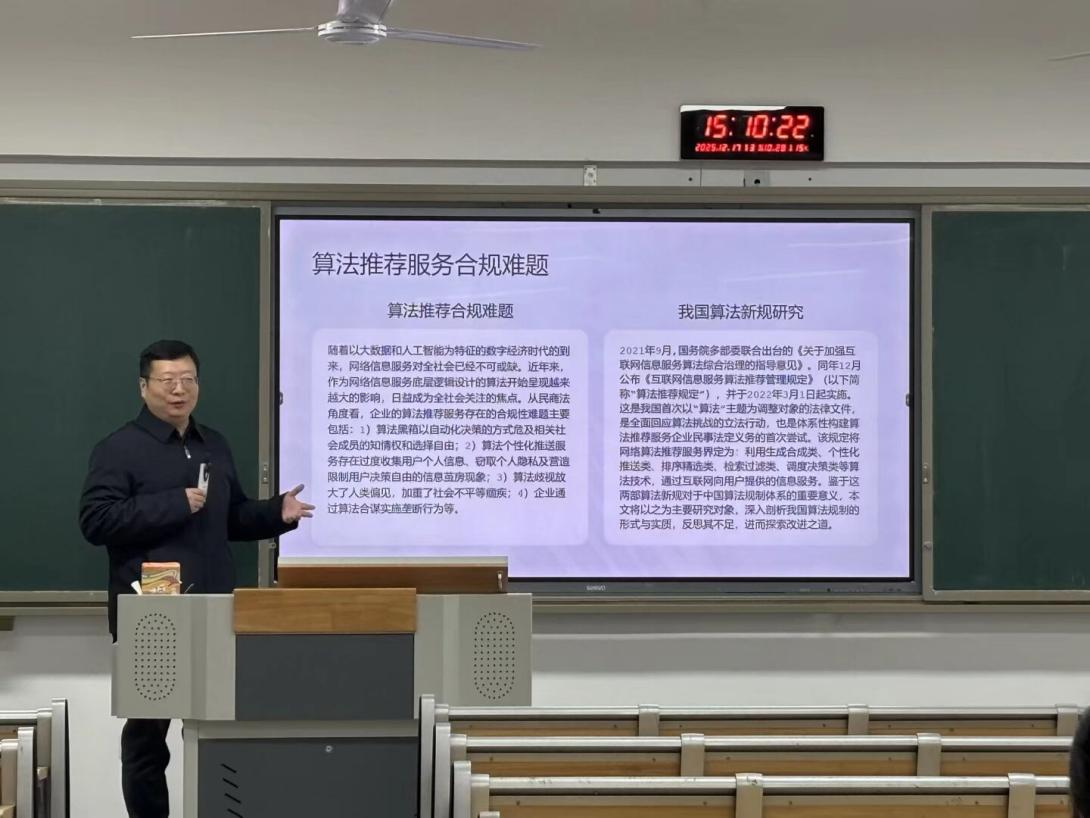 为深化师生对算法推荐服务法律规制的理解,探索数字时代算法治理的民事法律路径,12月17日,公司在东区B502举办了主题为“我国算法推荐服务提供者的民事法定义务体系构建”的学术讲座。本次讲座由秦立崴教授担任主讲人,知识产权专业师生及对算法治理领域感兴趣的同学到场聆听、互动交流,现场氛围热烈。