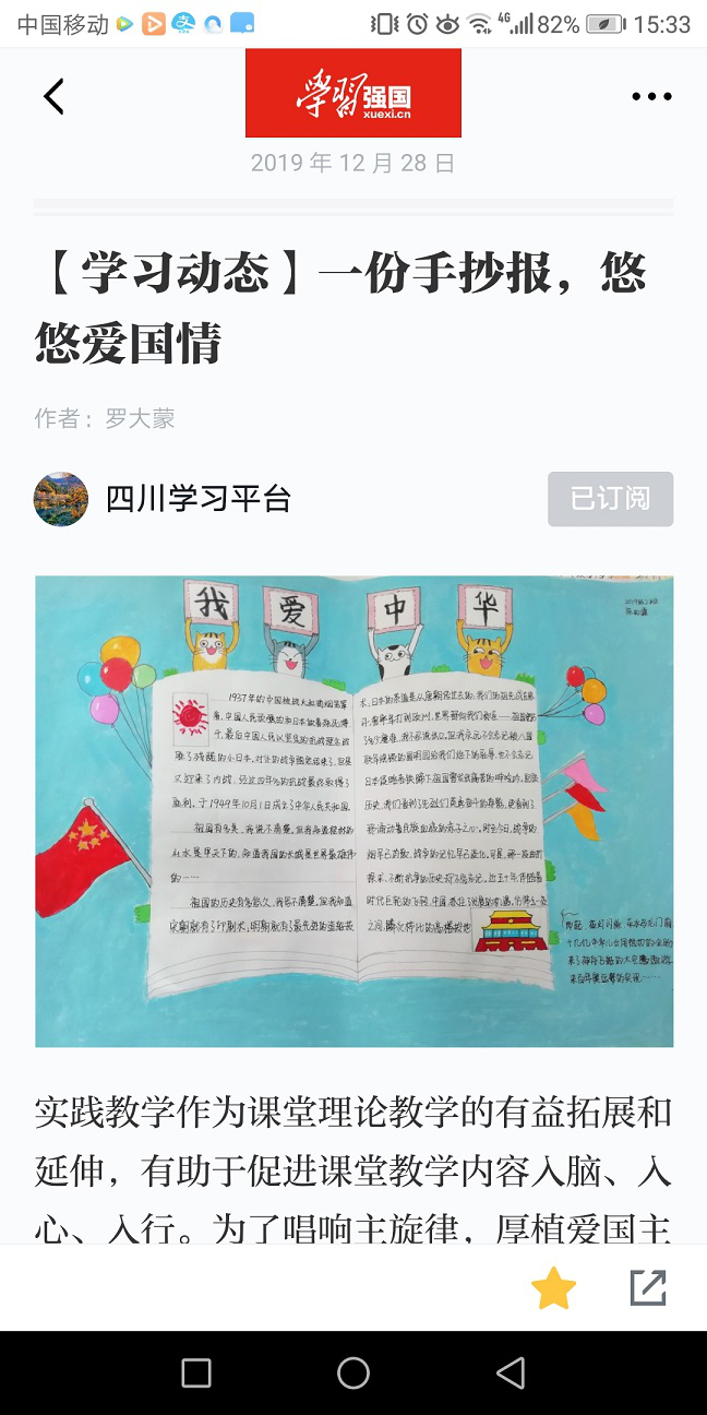12月28日,中共中央宣传部“学习强国”学习平台以《【学习动态】一份手抄报,悠悠爱国情》为题,报道了公司思政课实践教学改革的特色、亮点之一。