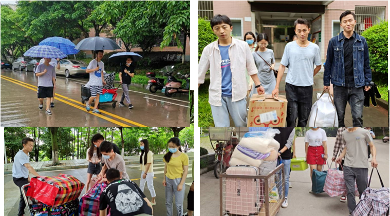 在毕业生离校期间,员工党员服务队不畏炎炎烈日,不惧倾盆大雨,帮助毕业生打包物品,用拖车帮助毕业生搬运行李,多次在寝室与快递站之间往返。员工党员还帮助毕业生打扫寝室卫生,挥手道别母校,将文明留给校园。