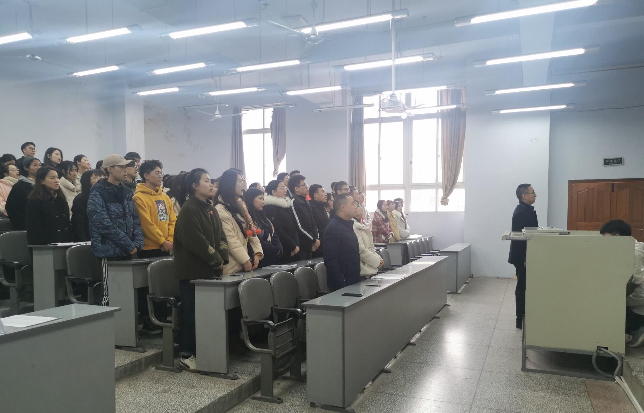 首先,全体参会人员在523教室进行第一次全体大会。由吴辉兵书记报告出席会议人数并宣布大会正式开始,大会开始后,全体起立,奏唱国歌。接着,吴书记对本期发展人数、发展对象名单和情况作了介绍,对会议程序、纪律、发言、记录等提出要求。