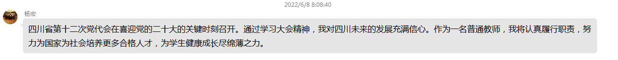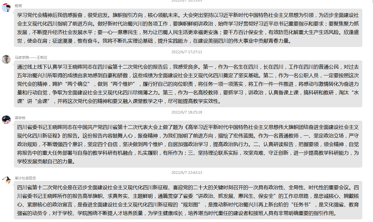 四川省第十二次党代会是在迈步全面建设社会主义现代化四川新征程、喜迎党的二十大的关键时刻召开的一次具有政治性、全局性、时代性的重要会议,从思想上政治上组织上为新时代治蜀兴川事业发展打下了坚实基础。会上,支部党员结合自身实际,纷纷交流学习党代会精神的感悟、收获和体会。大家一致认为,通过线上线下的认真学习,备受鼓舞,感悟良多。作为一名四川普通公民,对过去五年治蜀兴川所取得的成绩由衷地感到自豪和骄傲,这些成绩为全面建设社会主义现代化四川奠定了坚实基础;作为一名公职人员,一定要按照这次党代会的精神,拥护“两个确立”,做到“两个维护”,履行好自己的岗位职责,将任务一项一项落实,将工作一件一件推进,将感动与激情转化为奋进力量和行动自觉,争取为全面建设社会主义现代化四川尽绵薄之力;作为一名高校教师,要抓学习,讲政治,认真备课上课,搞科研和教研,淘汰“水课”讲“金课”,并将这次党代会的精神和要义融入课堂教学之中,尽可能提高教学实效性。