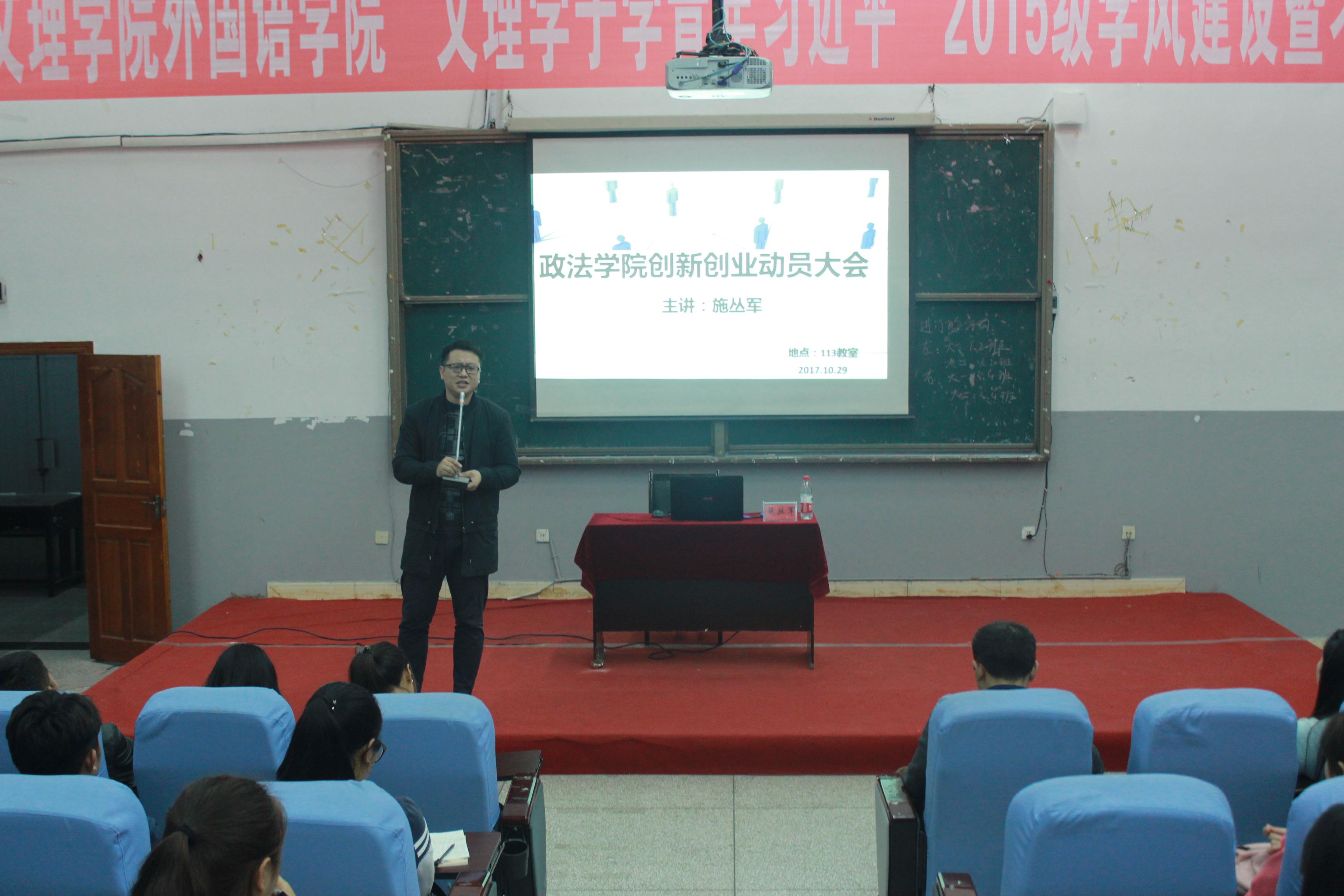 为进一步营造创新创业氛围,激发同学们的创新创业意识, 10月29日19时,Mksport体育在一教楼113教室召开老员工创新创业动员大会。原数财公司10级员工、通川区启智培训公司执行董事长、通川区青年企业家协会副会长施丛军应邀出席,党总支副书记张善喜、大一全体同学和大二入党积极分子参会。会议由辅导员刘丹主持。