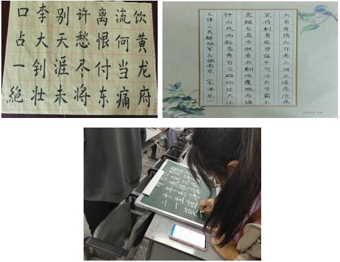 此次活动以钢笔字、粉笔字和毛笔字比赛的方式举行,以李大钊、毛泽东、陈毅等老一辈无产阶级革命家的诗词为书写内容。比赛现场,同学们满怀对老一辈无产阶级革命家的崇敬之情,用心用情书写革命先辈的诗词,尽其所能地展示自身书法的才能。无论是硬笔书法还是软笔书法,都书写内容完整,点化准确,笔锋有力,疏密有致,节奏感强,完美的展现了同学们的艺术修养。其作品中无不透着或规范、或严谨、或灵动的气质,同学们以认真、严谨的态度表达了对党的百年华诞的深切祝福。