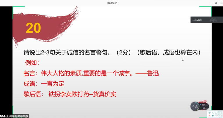 6月27日19:00时,为传承和弘扬中华民族诚实守信的传统美德,提高同学们的诚信素养,积极践行社会主义核心价值观,公司在腾讯会议上成功开展了诚信知识竞赛。此次竞赛邀请了公司团总支副书记彭森林、团总支常务第二副书记、员工会主席汪洁、团总支第三副书记李梅、员工会副主席杨淇童担任竞赛评委并参与小组分数统计。2018级、2019级共22支队伍参加竞赛。