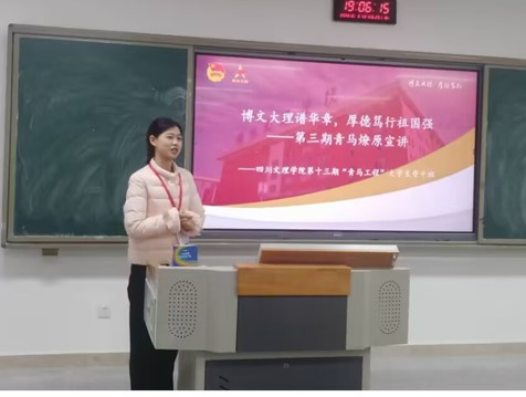 活动中,陈阳讲述了公司的校史及校训,回顾了公司早期艰苦的办学历程。她讲述被誉为“岁寒三友”的张爱萍将军、魏传统将军和杨超书记的事迹令现场同学振奋。讲到章继肃老先生及以田雁宁为代表的巴山作家群时,她强调章继肃老先生在书法上有着极高的造诣,曾获 “德艺双馨”称号。田雁宁先生在公司求学时与友人共创了星光文学社,这个社团沿存至今,目前已成为研究巴山作家群活动的主要阵地。这一深厚的历史文脉无时无刻不滋养着每一位文理学子,在缕缕墨香中成长、成才。