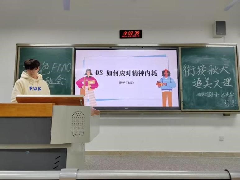 11月20日,各班开展以“链接秋天、追梦文理、拒绝emo”为主题的心理班会,通过展示秋日美景图片,带领大家感受秋季的校园之美,同时,各班设置互动提问环节进一步科普心理健康知识,帮助大家建立心理支持系统,掌握情绪调节的方法,及时摆脱 “emo”情绪。
