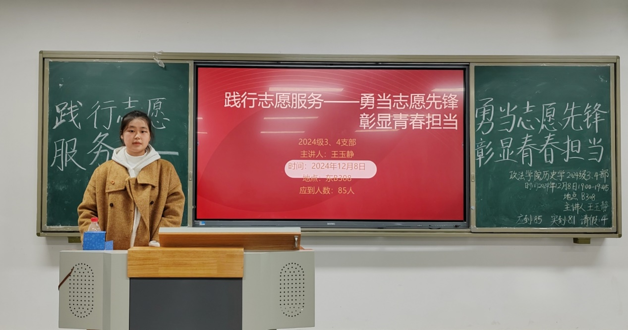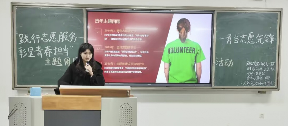 团会上,各班团支书通过图片和视频相结合的形式解读志愿服务的概念、内涵、意义等,讲述了志愿先锋们那些感人至深、光辉璀璨的事迹。团员青年们深刻地认识到志愿服务不仅对个人成长和发展有着积极影响,也对社会的和谐与进步起到关键作用,应从提高认识、注重实践、积极参与、带动他人四个方面在生活中积极践行志愿服务。