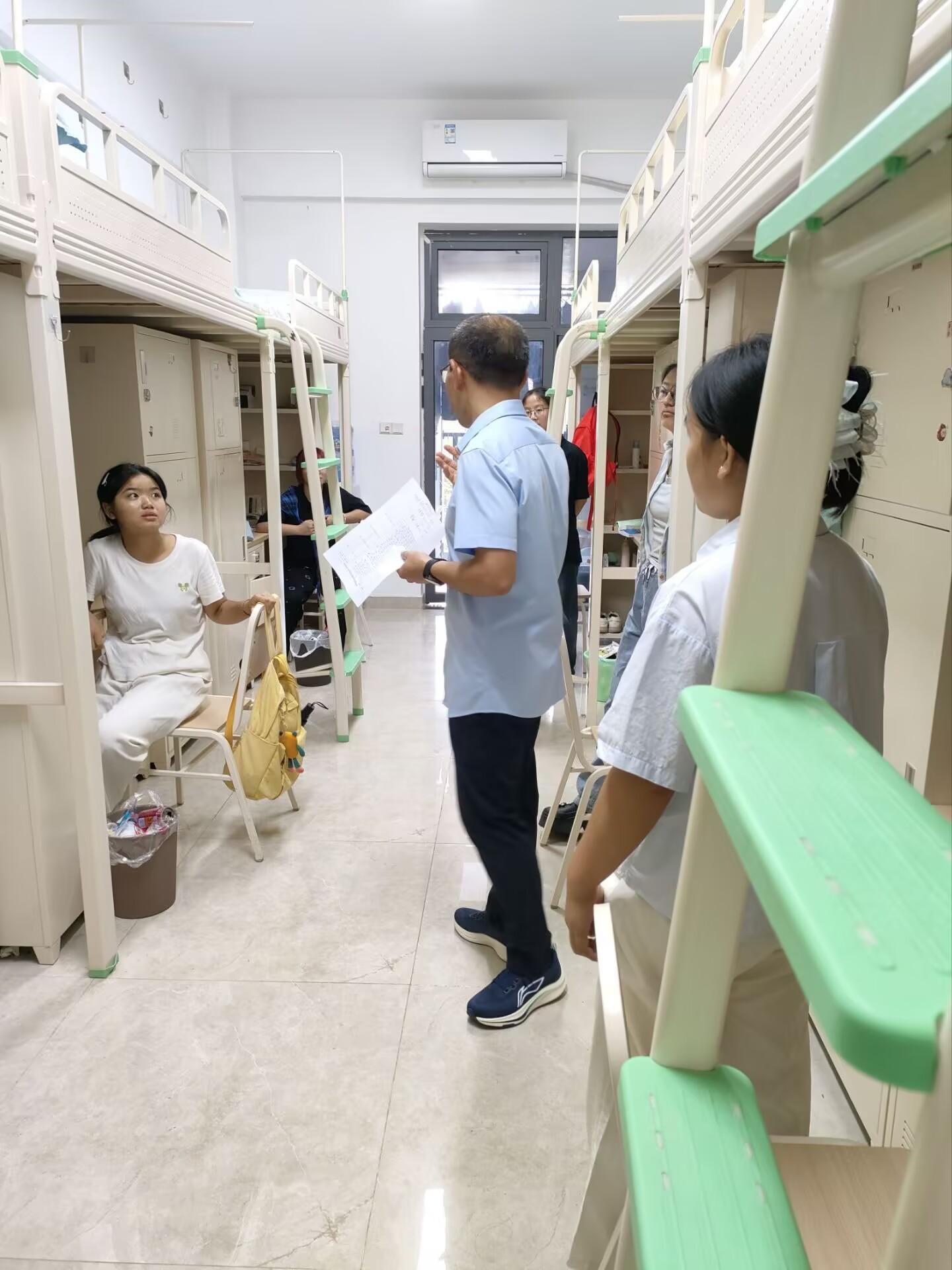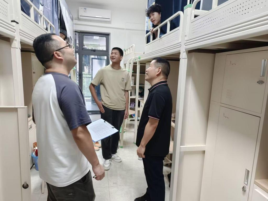 9月11日下午,公司党政领导班子带队,学工办全体人员随行,深入新生宿舍走访慰问刚完成入住安顿的2025级新同学。每走进一间寝室,领导们都笑意盈盈地与新生及陪同家长拉起家常:“老家是哪个省份的呀?”“食堂的饭菜还合口味吗?”“收拾行李、整理床铺时,有没有需要帮忙的地方?”一句句亲切问询,既细致了解大家的入住落实情况、对校园环境的适应程度,也耐心倾听大家初入校园的需求与建议。