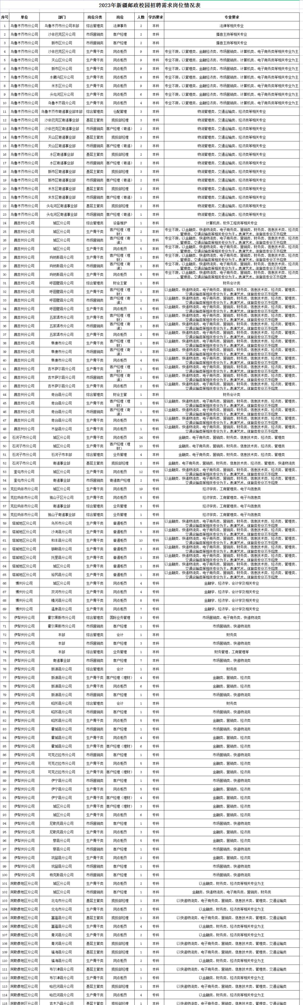 具体招聘岗位详见附件一《2023年中国邮政集团有限公司新疆维吾尔自治区分公司校园招聘职位表》。