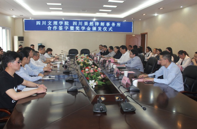 签字仪式之前,侯忠明副书记首先代表公司致辞并介绍公司情况,他介绍了公司的办学历史与现状、公司的办学思路、人才培养目标和培养模式,指出果然律师事务所的优势,希望双方共建共享,合作共赢。田金陇主任代表四川果然律师事务所讲话,他指出,文理公司的办事高效给他留下深刻印象,法律实践对培养法律人才具有重要意义。他结合设立“果然奖学金”的目的和四川果然律师事务所的理念向同学们提出三点希望:学会善意;学会沉心;学会坚持。