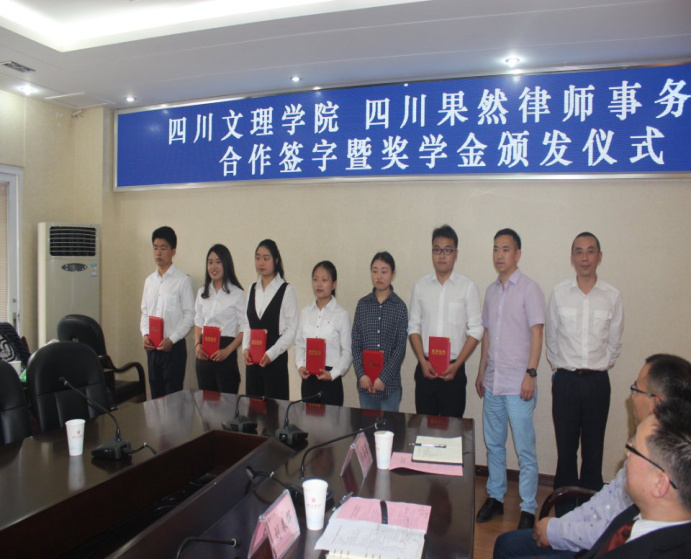 接下来,邓杰处长和田金陇主任分别代表双方签署校企合作协议。王成端书记代表公司向四川果然律师事务所授“Mksport体育app官网入口公司产品实践基地”牌匾。然后,邓杰处长宣读了2017-2018学年“果然奖学金”获奖名单,李魏、王顺平、何秀霞、王潇、任静欢、王川江等6名同学分别获得一二三等奖学金。朱世健和周健主任代表果然律师事务所向获奖员工颁奖。之后,李魏代表获奖员工发言,他首先对公司和四川果然律师事务所的培养与关心表示由衷感谢,他介绍了自己在文理公司的成长经历以及在律师事务所见习的收获,并誓言将荣誉化作动力,今后更加努力地学习和工作。