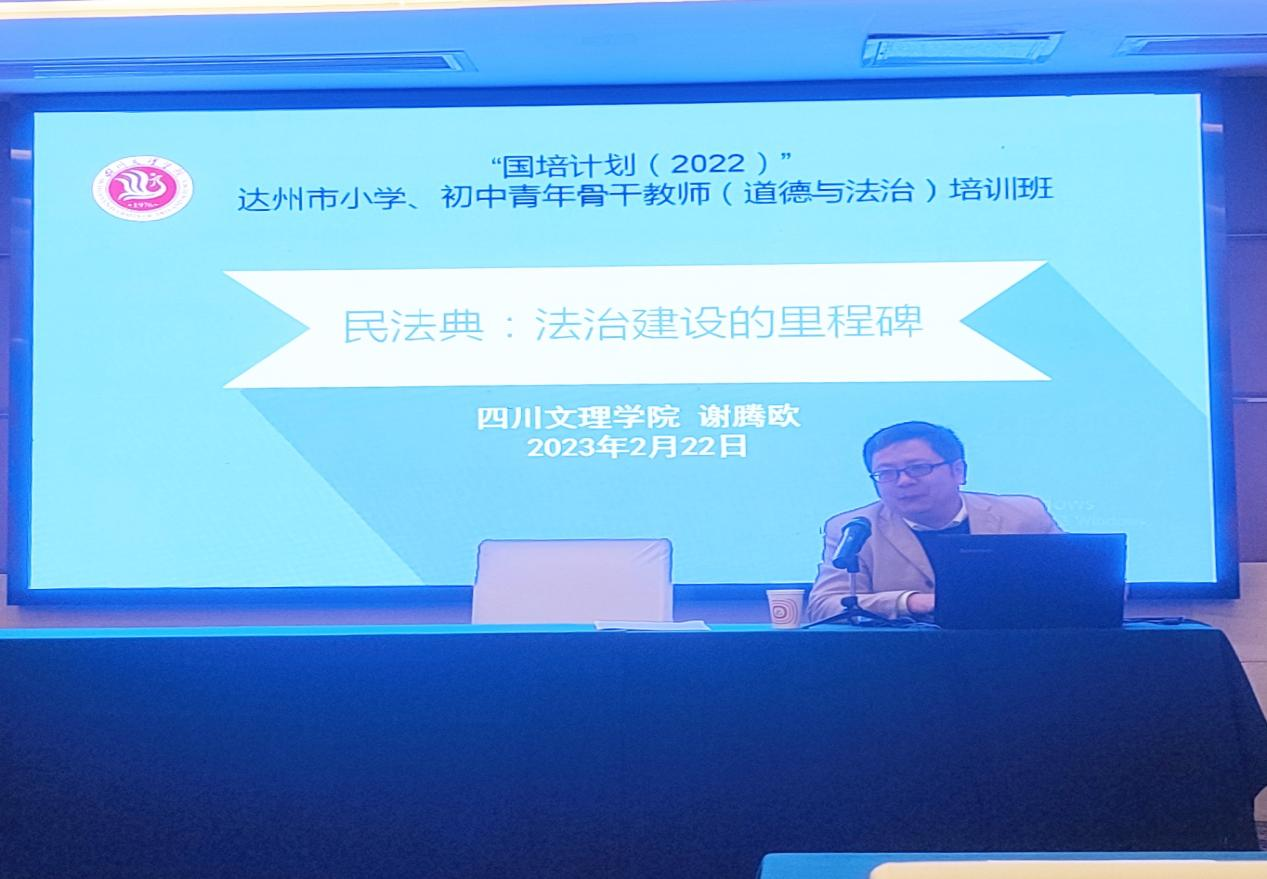 为进一步提高达州市小学、初中道德与法治课教师的业务能力,达州市教育科学研究所于2023年2月20日至24日组织开展了“国培计划(2022)”达州市小学、初中青年骨干教师(道德与法治)培训。四川省知识产权培训(Mksport体育app官网入口)基地办公室主任谢腾欧应邀于26日下午为参加培训的达州市小学、初中青年骨干教师做题为《民法典:法治建设的里程碑》的讲座。